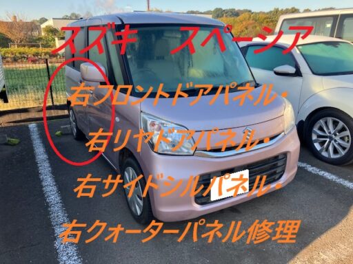 千葉市|千葉市若葉区|佐倉市|スズキ スペーシア 右フロントドアパネル 右リヤドアパネル 右サイドシルパネル 右クォーターパネル 板金 鈑金 修理 キズ へこみ キズ修理 へこみ修理 取替 交換 保険 保険修理