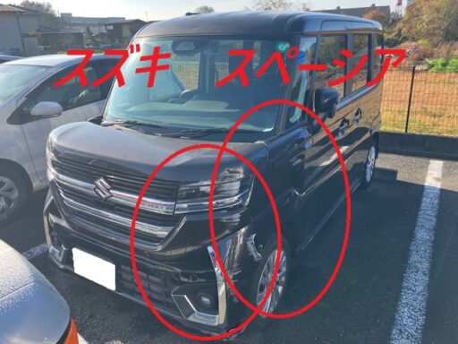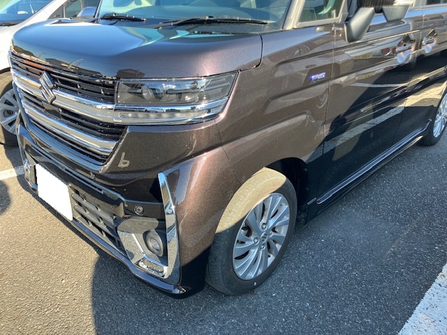 千葉市|千葉市若葉区|佐倉市|スズキ スペーシア フロントバンパー ラジエータグリル 左ヘッドライト ボンネット 左フロントフェンダパネル 左フロントドアパネル 板金 鈑金 修理 キズ へこみ キズ修理 へこみ修理 取替 交換 保険 保険修理