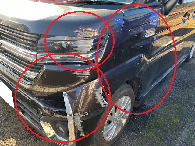 お客様のお話しですと、雨の日に、白線でスリップしてしまったそうです。左前側に色々な損傷が確認できます。(-_-;)