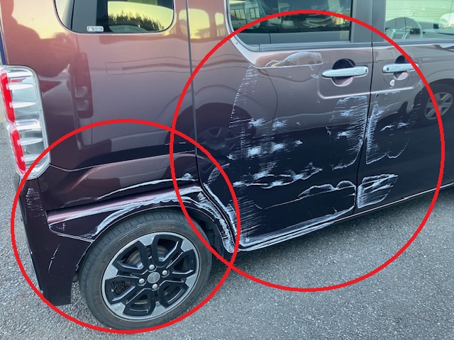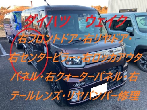 千葉市|千葉市若葉区|佐倉市|ダイハツ ウェイク 右フロントドアパネル 右リヤドアパネル 右センターピラー 右クォーターパネル 右テールレンズ リヤバンパー 板金 鈑金 修理 キズ へこみ キズ修理 へこみ修理 取替 交換 保険 保険修理