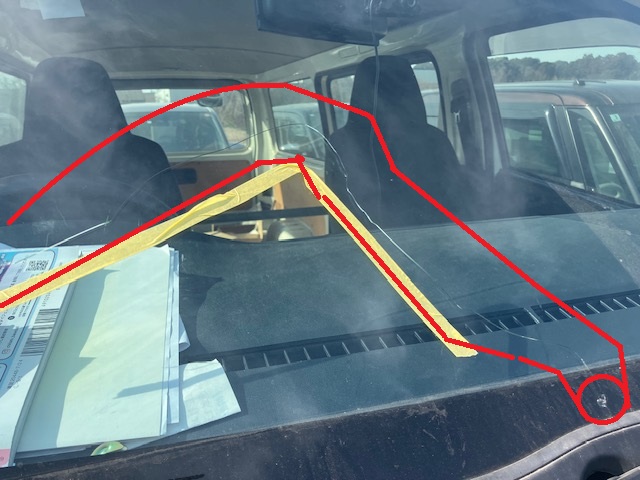 お客様のお話しですと、走行中に何かが飛んできたみたいで、「ピシ」と音がして、フロントガラスにキズ、ヒビが出来てしまったそうです。最初は、2~3センチのヒビだけでしたが使用していましたら写真の通り、どんどん伸びてきてしまったそうです。(-_-;)