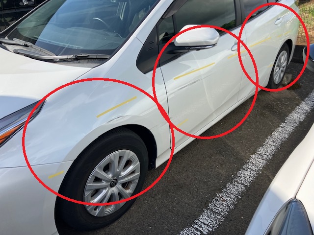 お客様のお話しですと、ガードレールに接触してしまったらしいです。左側側面、前から後ろまでキズ・ヘコミなどが出来てしまっております。(-_-;)
