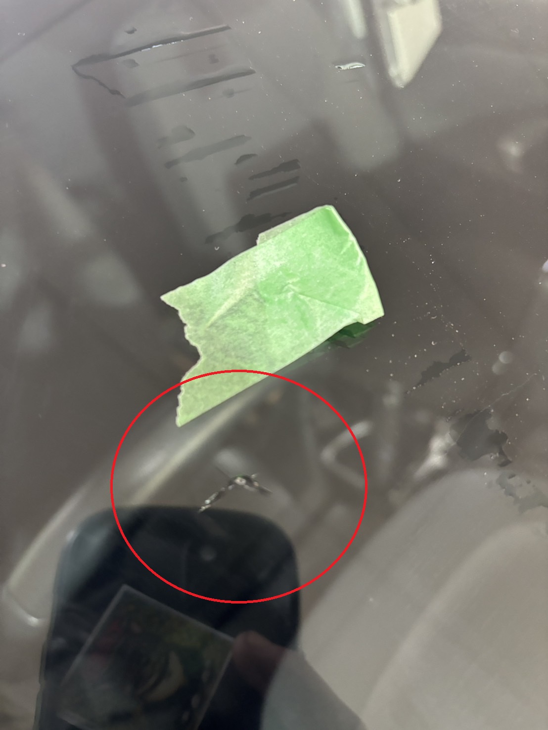 お客様のお話しですと、国道を走行中にいきなり「ピシ」と音がしてガラスに小さいヒビが入ったそうです。写真は小さいときに撮った写真です。その後、使用していたらヒビが伸びてしまったと言う事で、ガラス交換が必要になってしまいました。(-_-;)