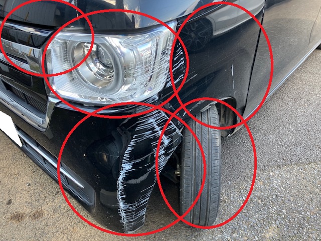 フロントバンパー・左ヘッドライト・左フロントフェンダー・フロントロアクロスメンバー・トランスミッション・左フロントサスペンション・左フロントタイヤ・左ホイール修理になります。