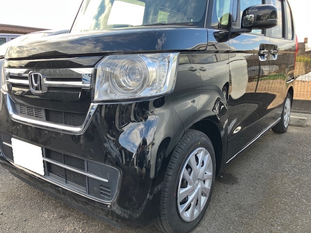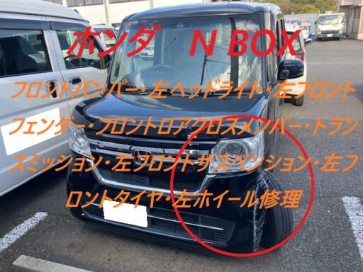 千葉市|千葉市若葉区|佐倉市|ホンダ N BOX フロントバンパー・左ヘッドライト・左フロントフェンダー・フロントロアクロスメンバー・トランスミッション・左フロントサスペンション・左フロントタイヤ・左ホイール修理 板金 鈑金 修理 キズ へこみ キズ修理 へこみ修理 取替 交換 保険 保険修理