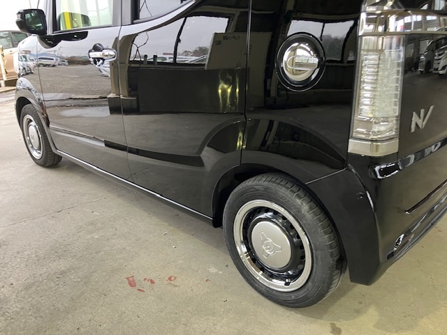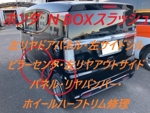 千葉市|千葉市若葉区|佐倉市|ホンダ N BOXスラッシュ 左リヤドアパネル 左サイドシルピラーセンタ 左リヤアウトサイドパネル リヤバンパー ホイールハーフトリム 板金 鈑金 修理 キズ へこみ キズ修理 へこみ修理 取替 交換 保険 保険修理
