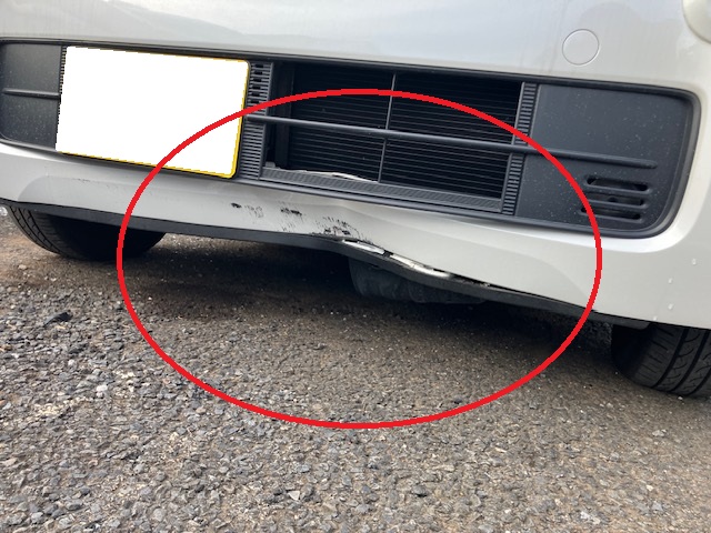 お客様のお話しですと、お店に入る際に勢いよく歩道に入ってしまい歩道の少し高くなっている部分にぶつかってしまったそうです。フロントバンパーの下側がぶつかってしまっております。(-_-;)