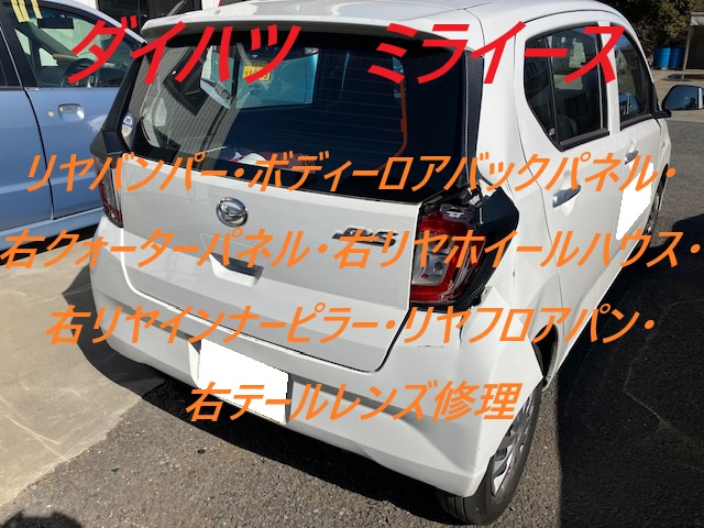 千葉市|千葉市若葉区|佐倉市|ダイハツ ミライース リヤバンパー ボディーロアバックパネル 右クォーターパネル・右リヤホイルハウス・右リヤインナーピラー・リヤフロアパン・右テールレンズ 板金 鈑金 修理 キズ へこみ キズ修理 へこみ修理 取替 交換 保険 保険修理