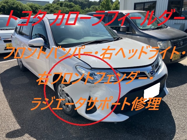 千葉市|千葉市若葉区|佐倉市|トヨタ カローラフィールダー フロントバンパー 右ヘッドライト 右フロントフェンダー ラジエータサポート 板金 鈑金 修理 キズ へこみ キズ修理 へこみ修理 取替 交換 保険 保険修理